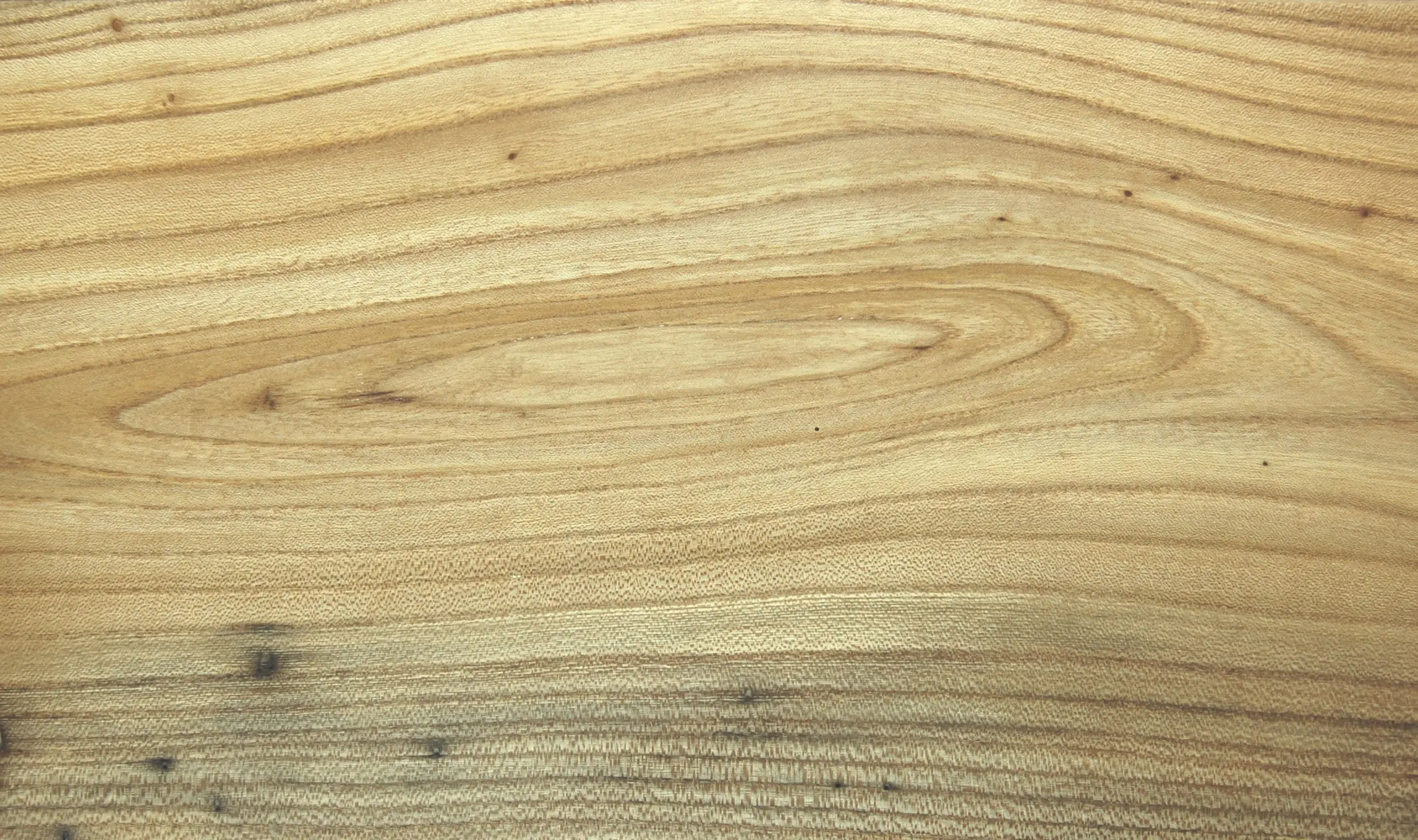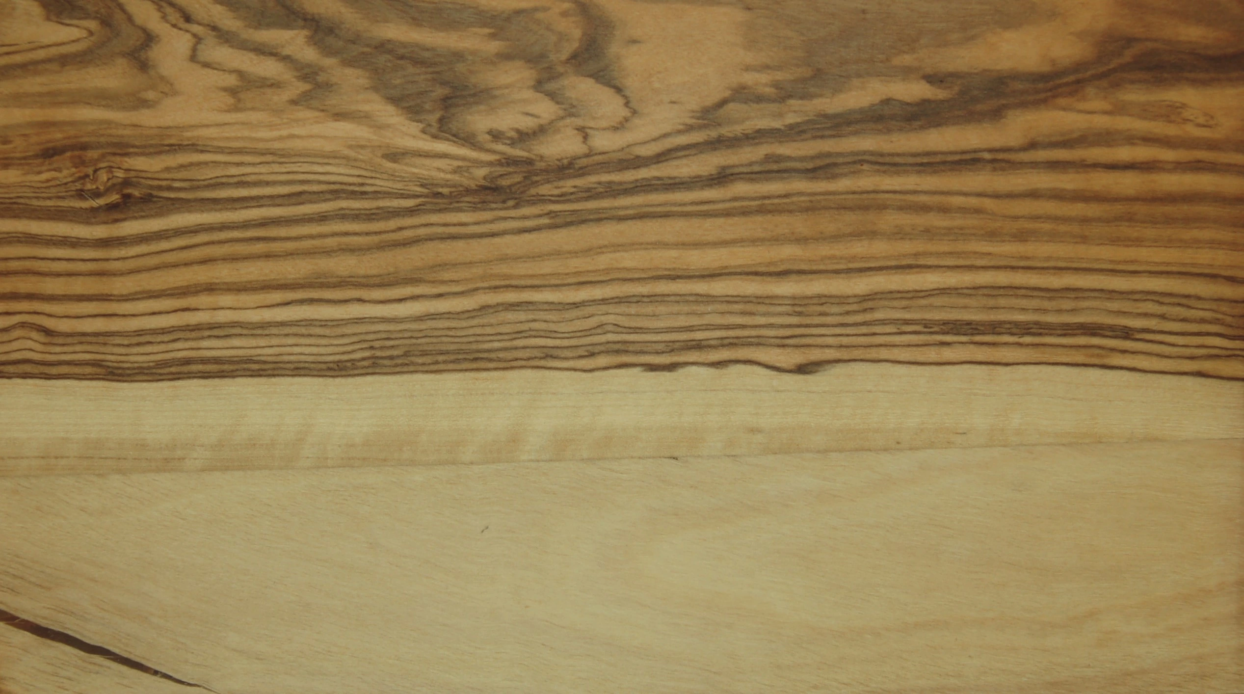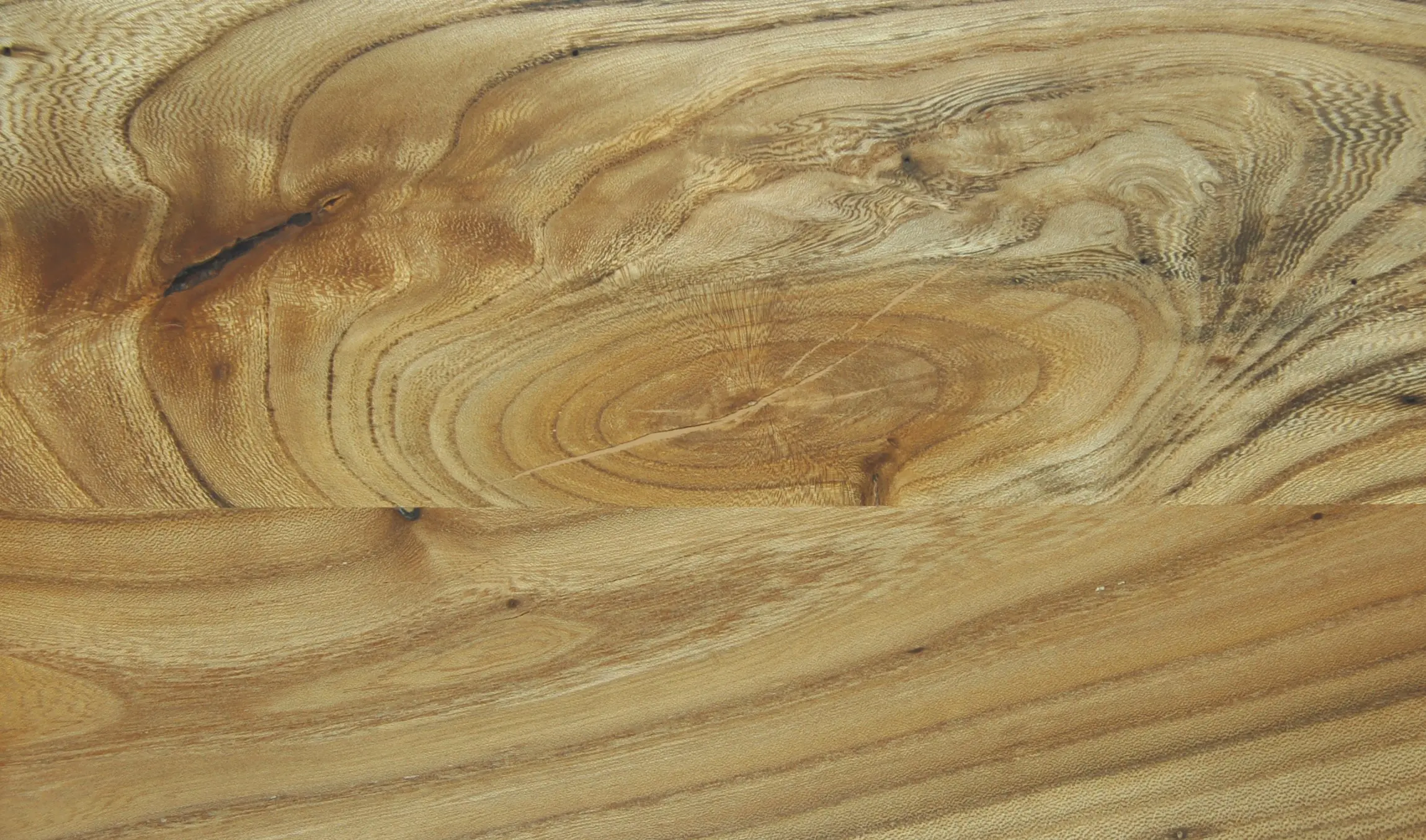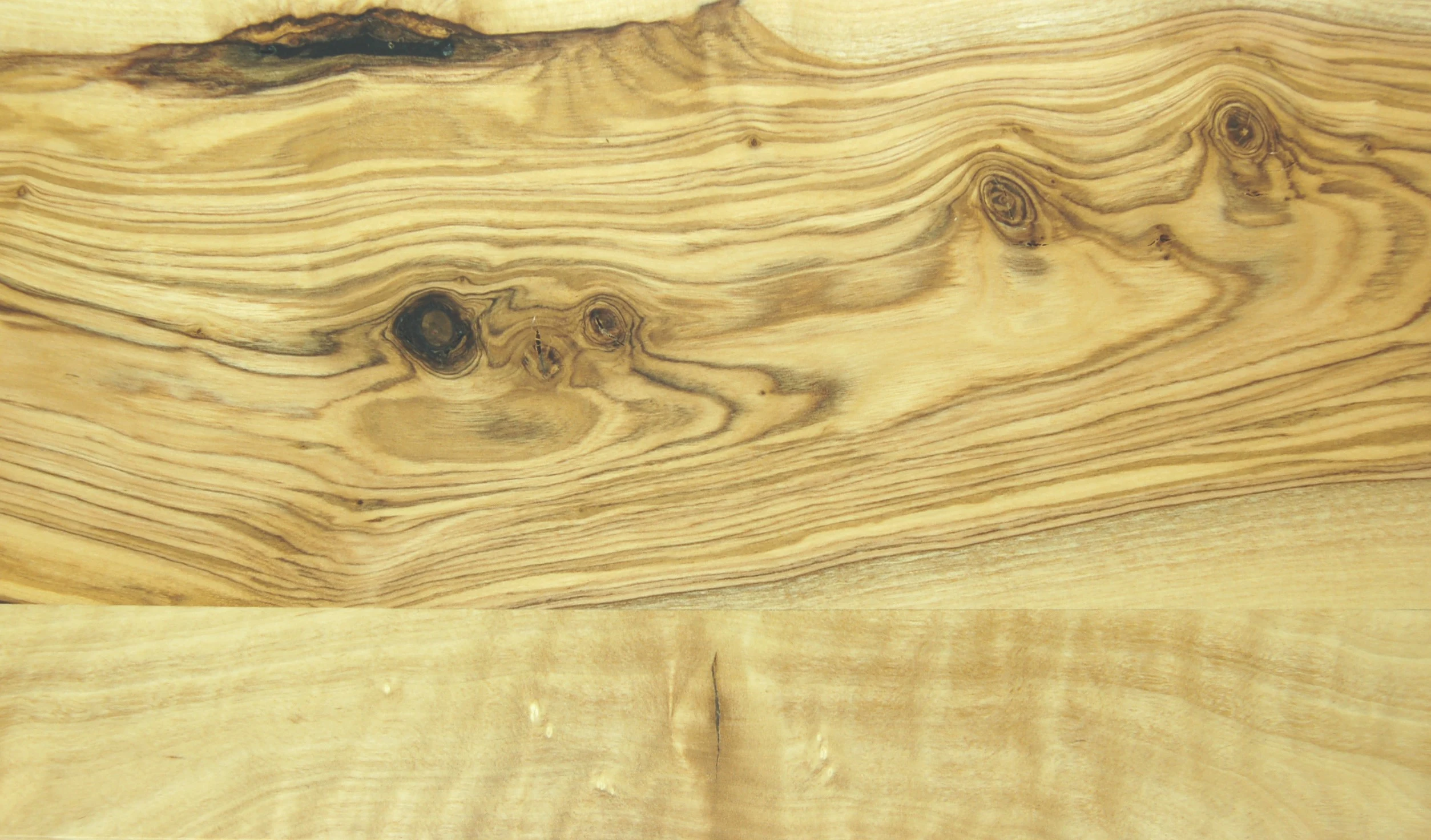 Kernholz warm rotbraun, Splintholz in schönem Grauton. Zwischen den deutlichen Jahresringen ist eine kleinräumige Sekundär-Maserung erkennbar. Diese verändert sich mit dem Blickwinkel des Betrachters und macht Olmo so besonders ansehnlich. Nach längerer Lagerung können Madenlöcher auftreten – diese werden häufig als rustikale Designelemente genutzt.