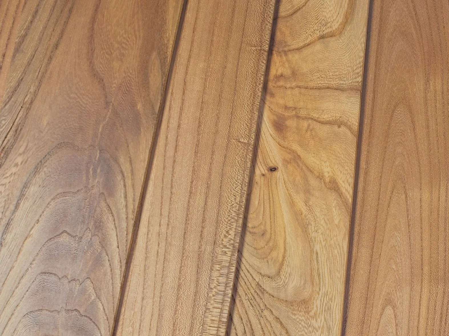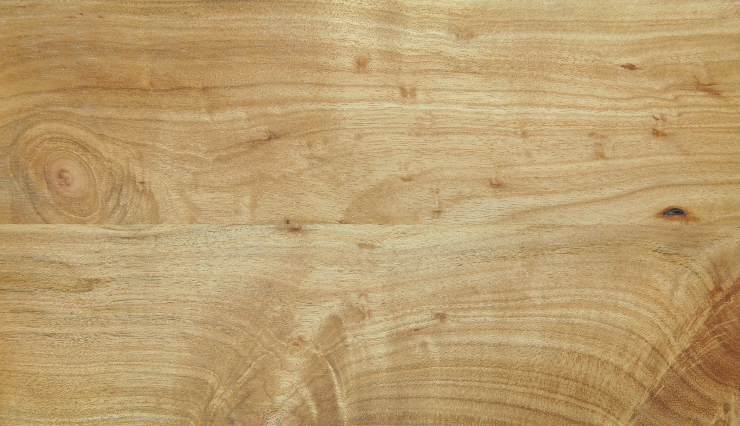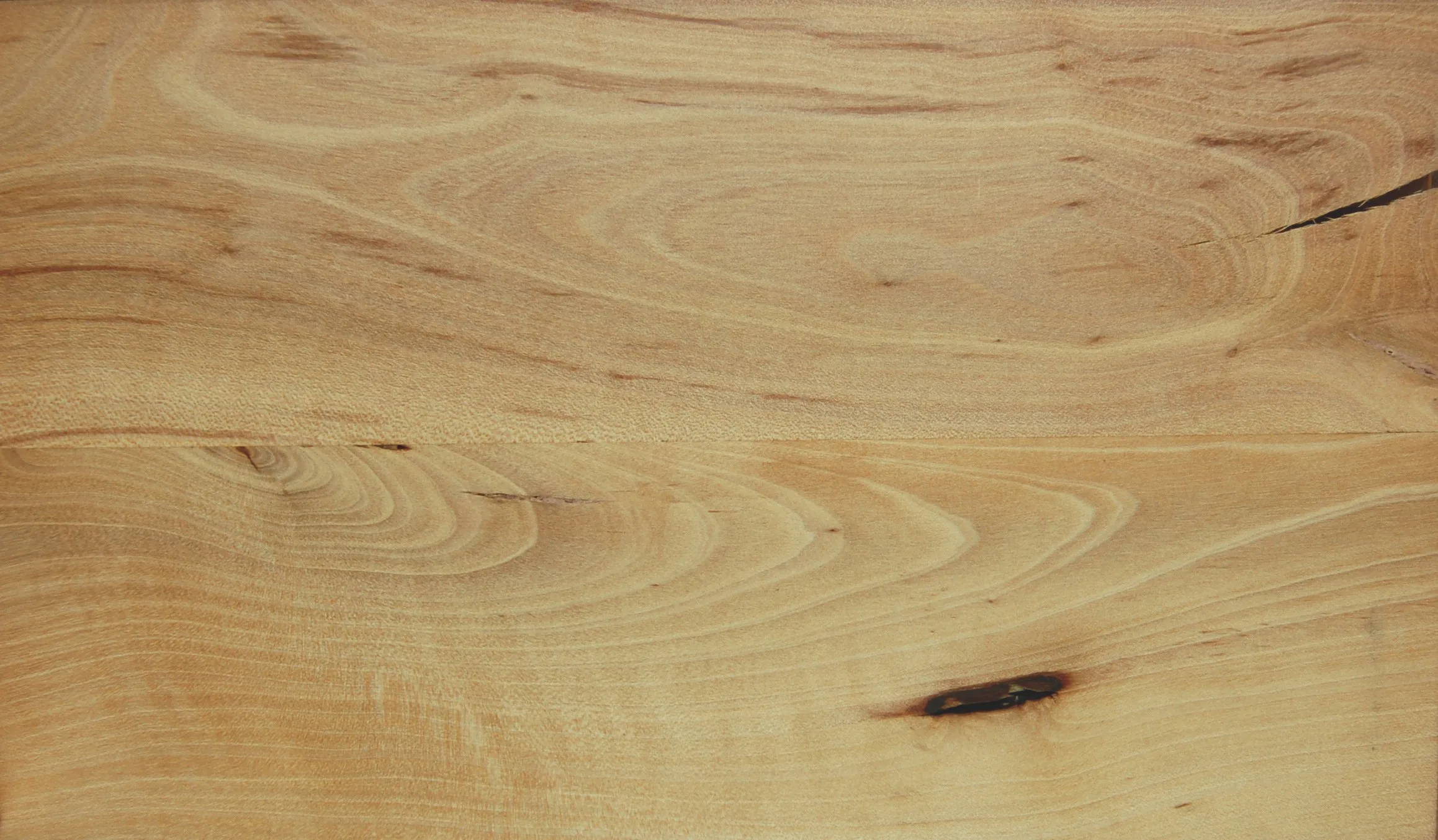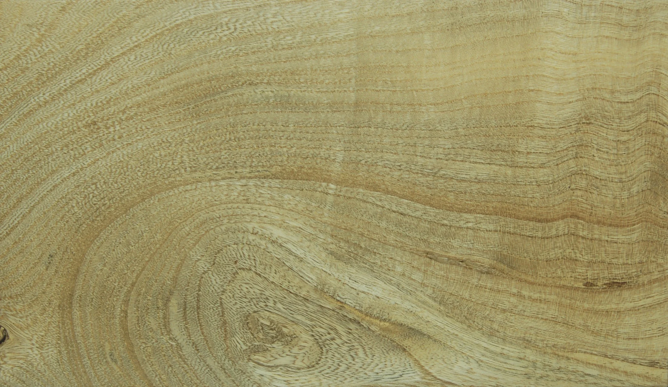 Kernholz warm rotbraun, Splintholz in schönem Grauton. Zwischen den deutlichen Jahresringen ist eine kleinräumige Sekundär-Maserung erkennbar. Diese verändert sich mit dem Blickwinkel des Betrachters und macht Olmo so besonders ansehnlich. Nach längerer Lagerung können Madenlöcher auftreten – diese werden häufig als rustikale Designelemente genutzt.