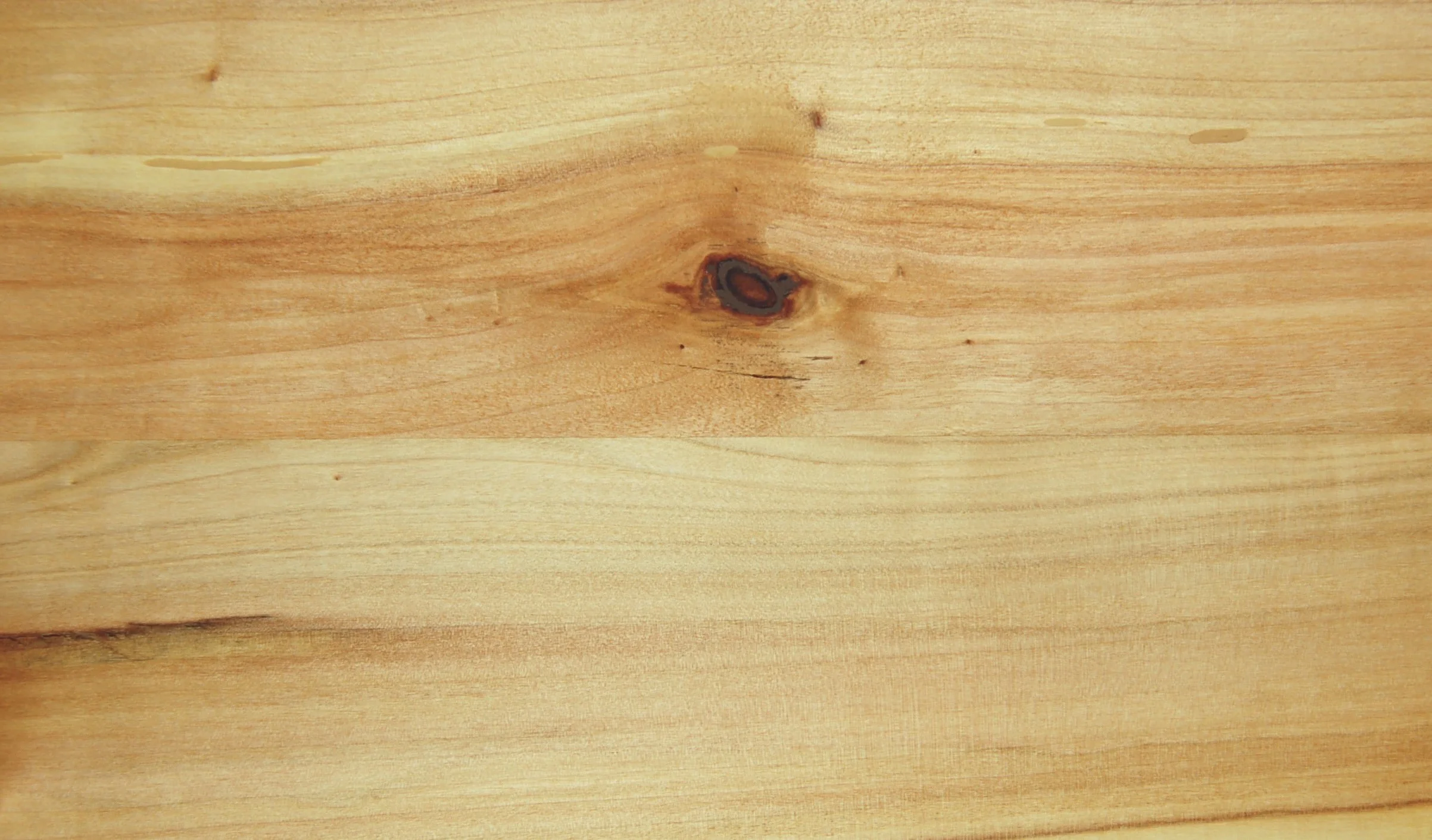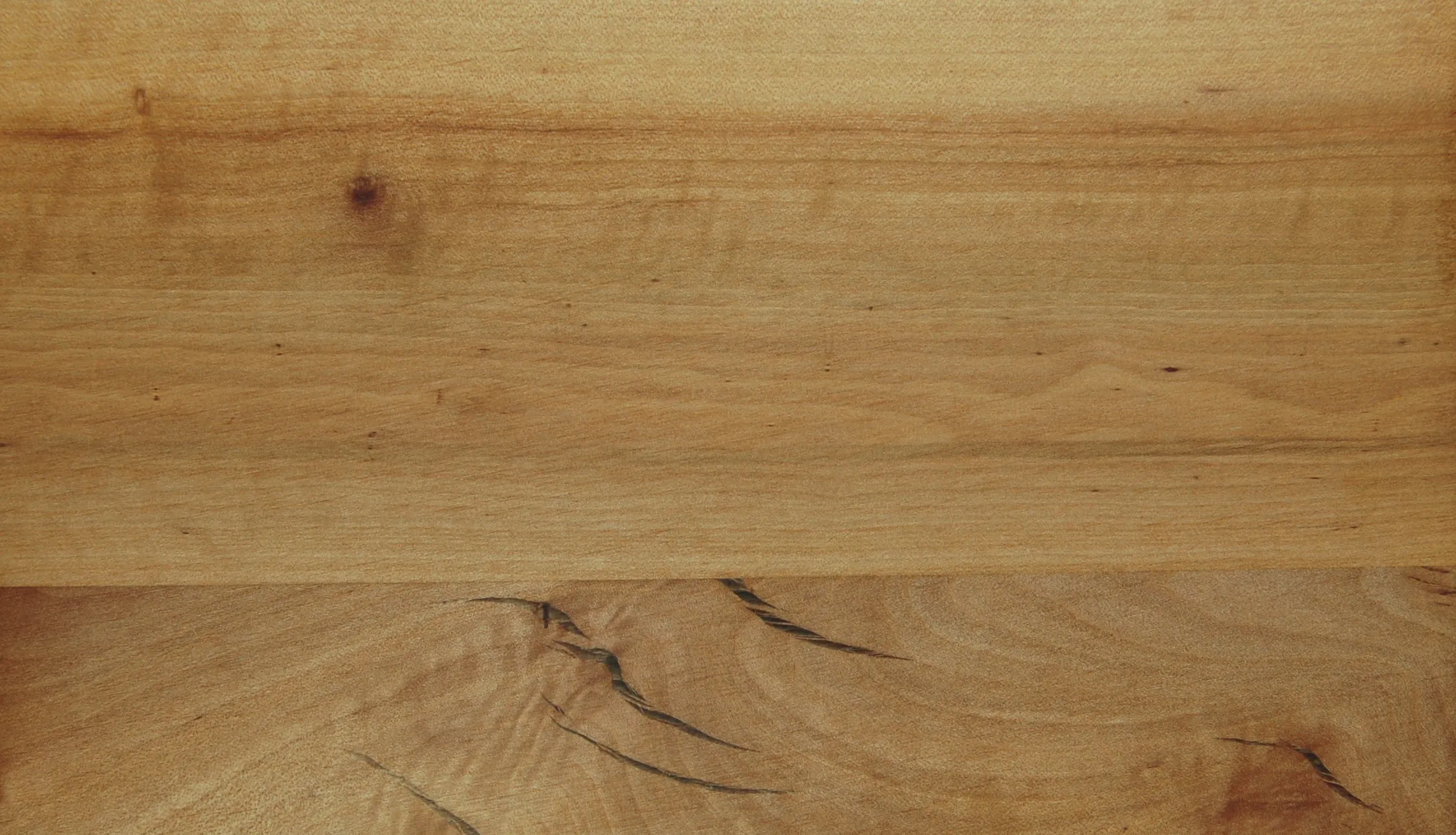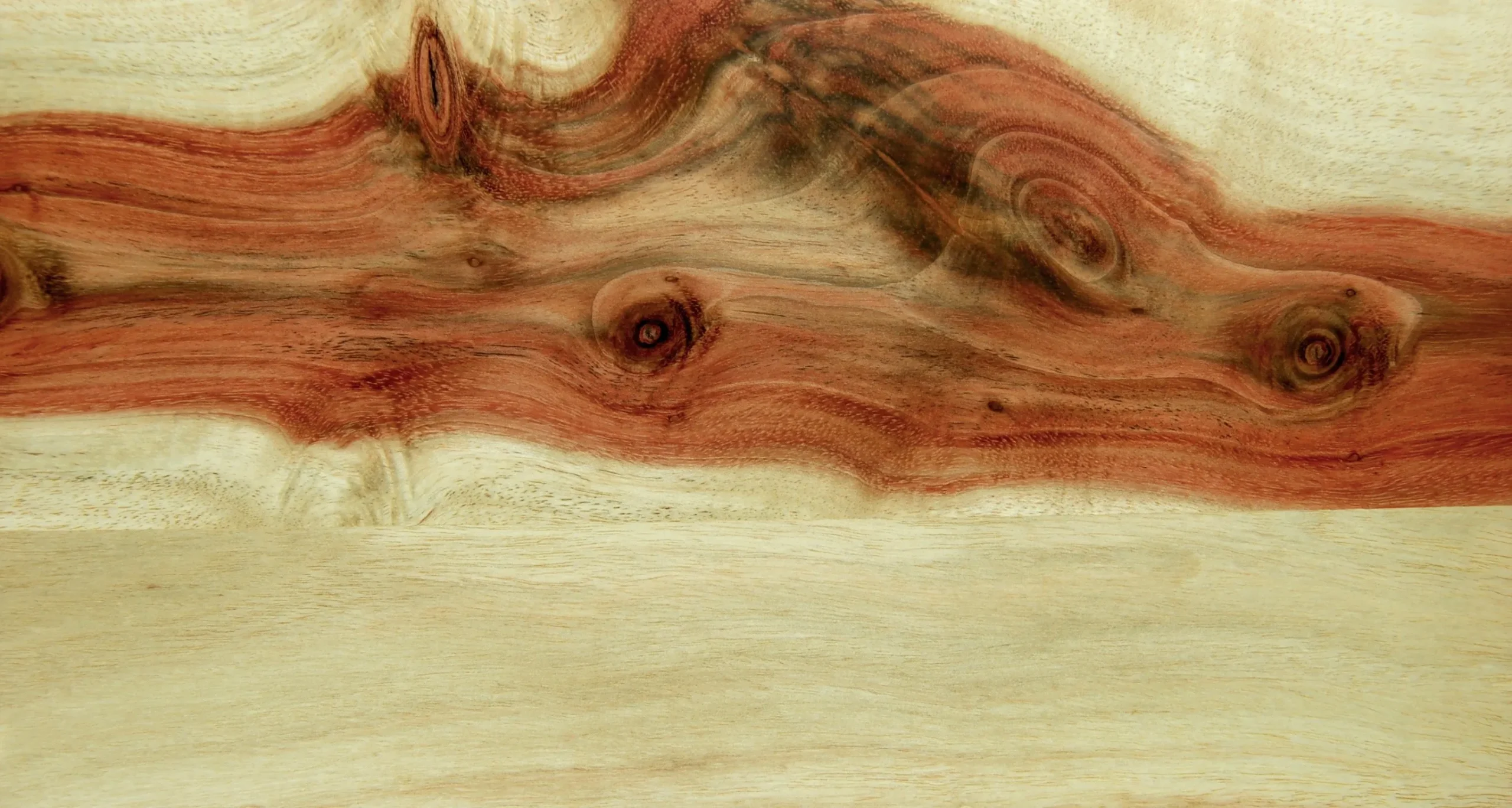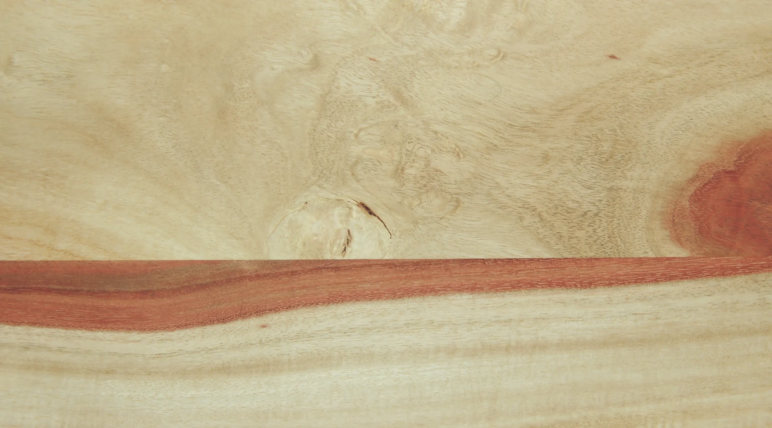 Das Holz zeigt rötliche Töne, gelegentlich durchzogen von Blau- und Grünanteilen – abhängig vom Wuchsstandort und den Mineralien im Boden. Der Splint ist heller und setzt sich deutlich vom Kernholz ab, kann aber dennoch gut mitverarbeitet werden. Die Maserung ist eher ruhig mit gelegentlichen Farbspielen.
